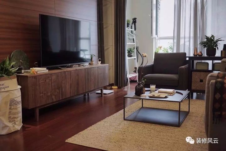 大片的红木色地板,让客厅有沉闷感,为了尽可能减少地板的影响,谷琪饼在客厅铺了一大块浅色的地毯,起到提亮的作用。