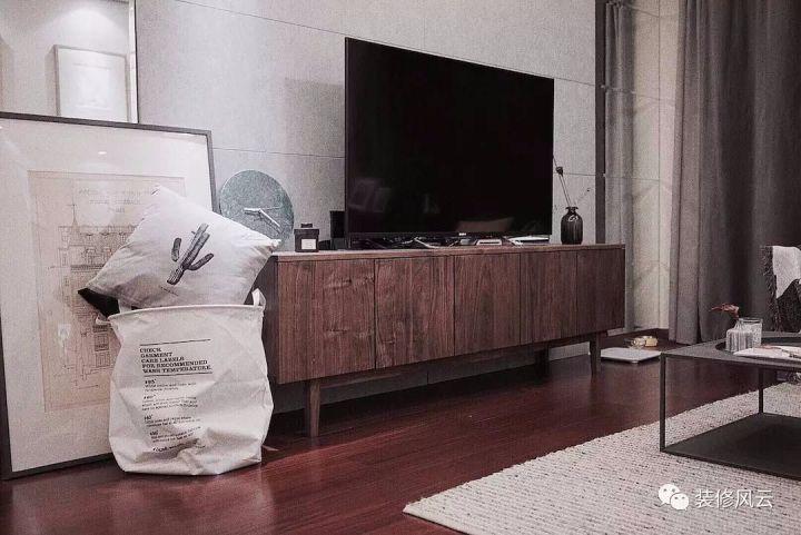 浅色的地毯跟水泥电视墙也的颜色也相互呼应。