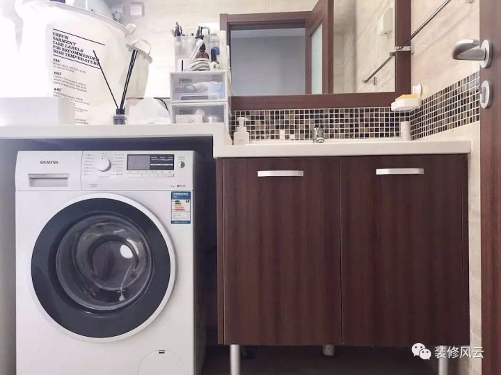 洗衣机上方的台面,谷琪饼放了脏衣篮,还用一些收纳盒装了一些化妆品和洗漱用品,充分利用纵向空间。