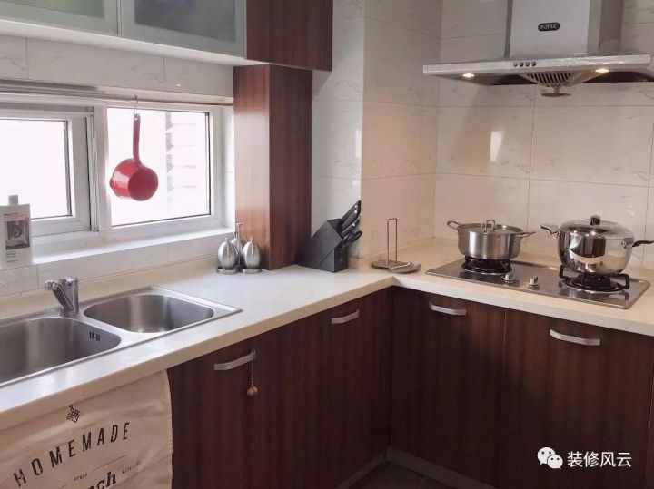水槽位于在U字最底部,也就是厨房中间,洗手、洗菜、洗刀、洗锅,都很方便。水槽两边都有40公分以上的台面长度,不管是作为操作区,还是作为备餐区都足够了。
