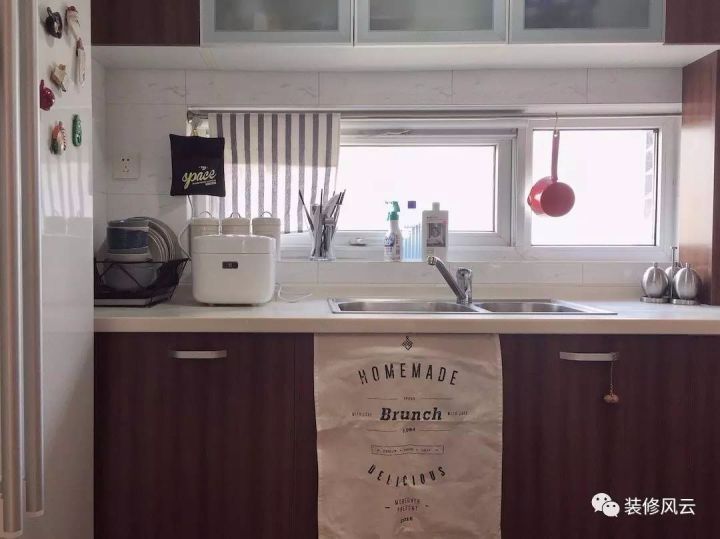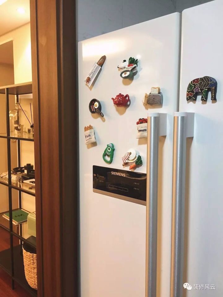 冰箱放在厨房门旁边,靠近餐厅,平时拿取食物都方便。还用了很多可爱的冰箱贴装点冰箱的大白门。