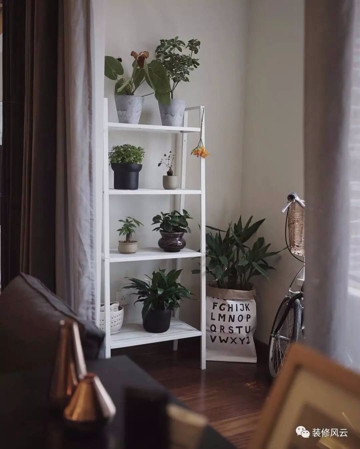 阳台放了一个宜家的置物架做花架,摆满了绿植,增添了很多生机。