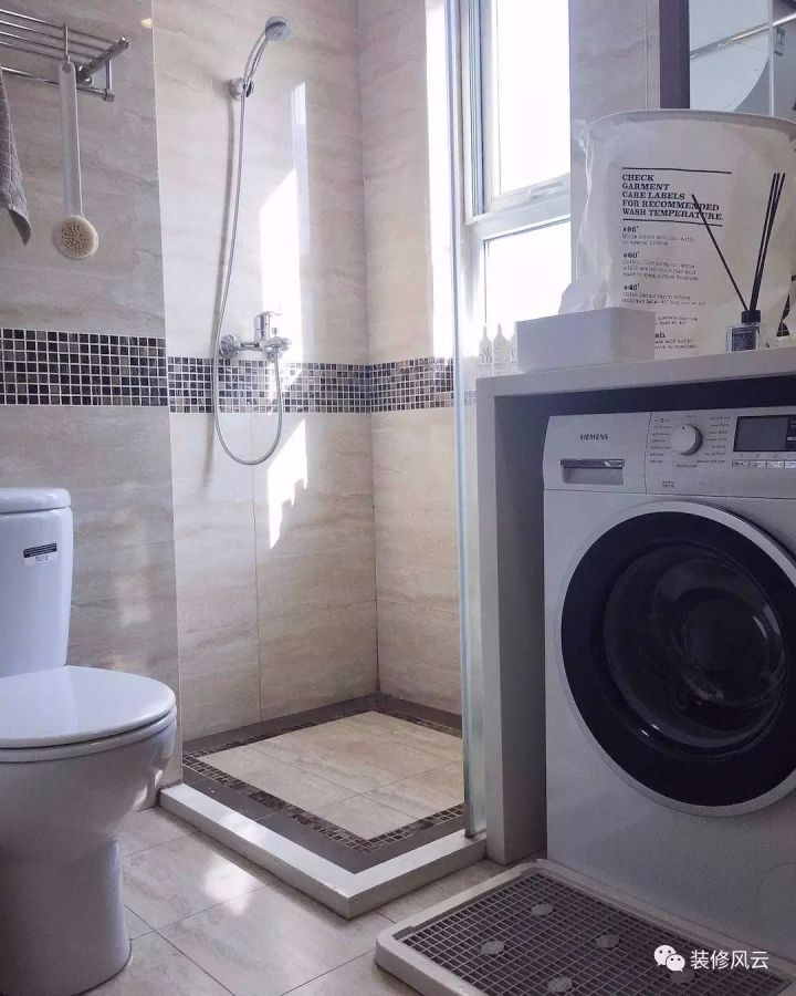 卫生间的布局非常合理,在有限的空间内,塞下了洗衣机,淋浴间,浴室柜……