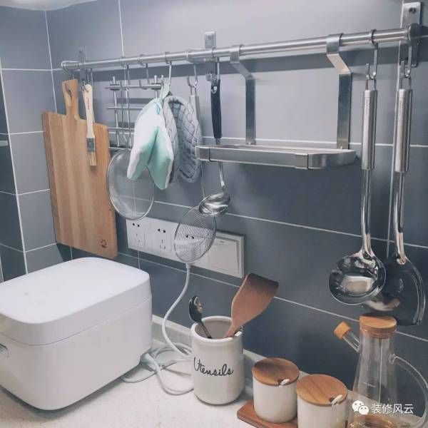 如果把所有的东西一股脑的全堆放在这个区域,再宽的空间也不够摆放的,这时候,把能挂起来的,都给挂起来。调料罐也遵循之前讲到的统一原则,换成统一的调料罐,这样看起来也不乱。对比下,原来的厨房,大小不一的瓶瓶罐罐,是不是很乱呢?