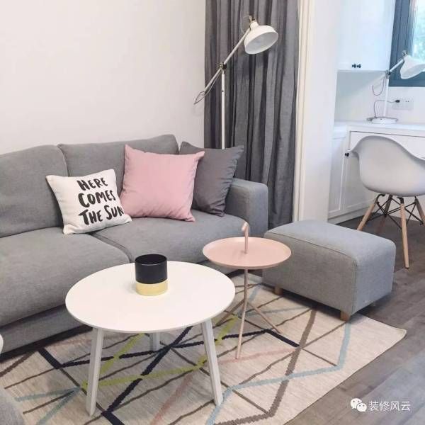 虽然做了电视柜,但因为浅淡的配色和灵巧的外观,所以客厅并没有局促的感觉。灰色L型沙发放在客厅也不觉得挤。天天偏爱粉色,所以靠垫和茶几特地选择了粉色,其他则用黑白灰搭配,和谐的色彩~