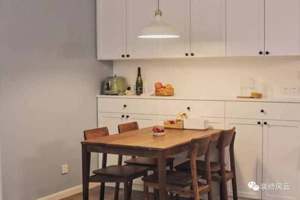 胡桃木材质的桌子,不易开裂变形,家里的家具以浅色白色为主,颜色较重的胡桃木可以起到中和的作用,餐厅的餐桌和餐椅都统一搭配的。