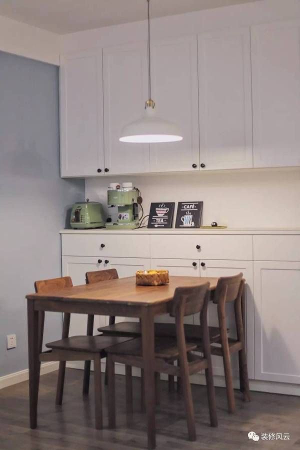 餐边柜餐厅加上了一个餐边柜;因为没有玄关,没办法做鞋柜,所以餐边柜的下方可以放上鞋子,而中间的台面,放上面包机和咖啡机,享受早餐咖啡。