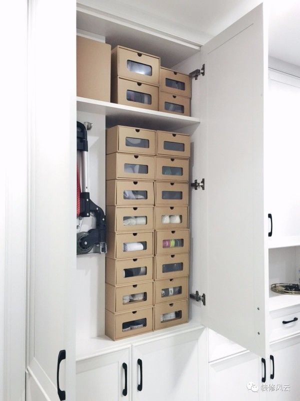 收纳柜里的透明抽屉鞋盒,能整齐地收纳好多鞋。
