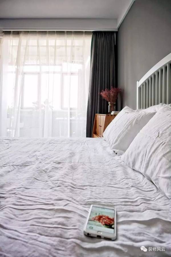 主卧和阳台之间原来有一扇长条窗,装修时拆了窗户,变成一个天然画框,无论是放一盆花还是蹲一只喵,都自成风景。