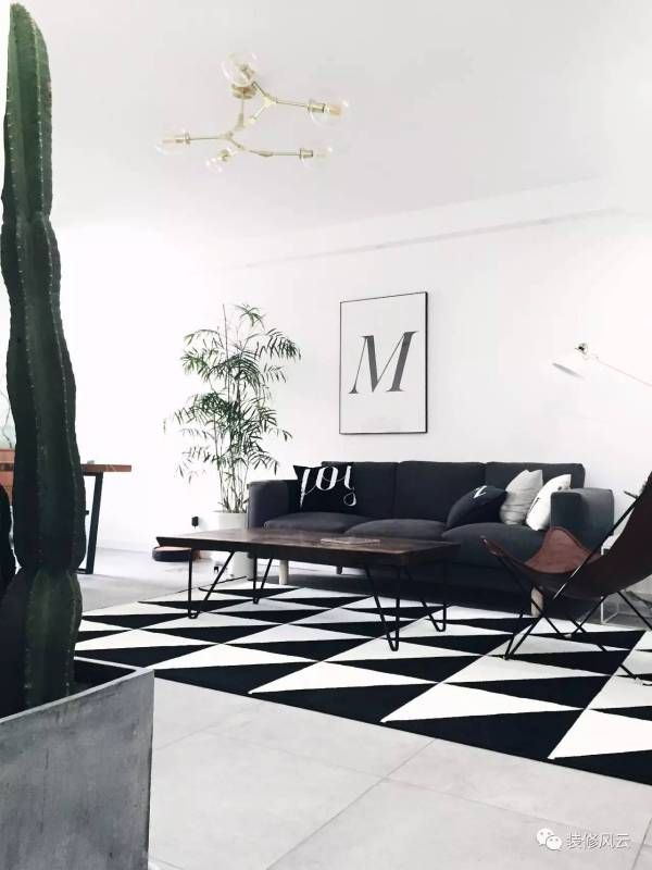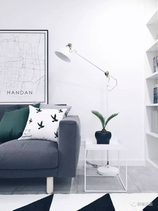 一进门就能看到沙发,长条户型比较窄,为了避免让沙发墙和电视墙有太近的感觉,沙发墙上只挂了一张简单的字母海报,就怕给人太过拥堵的视觉感受。