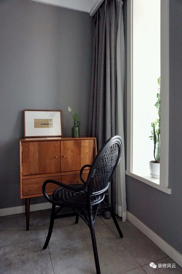 现在把沙发移到床边,窗下放了二黑边柜和一把藤椅。