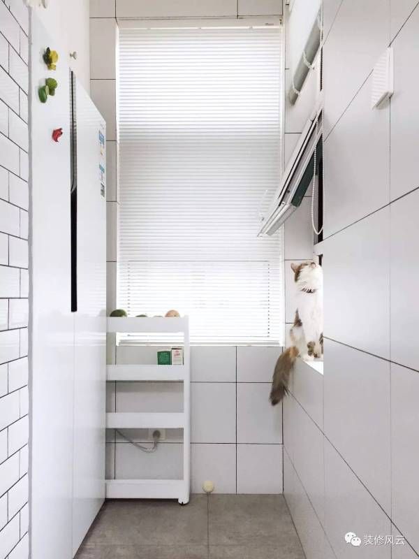 厨房最北面有一个小阳台,塞进一个双开门冰箱就满了,好在还有两扇小窗透气。冰箱和墙壁之间放了一个缝隙车,用来放葱姜蒜水果零食等杂物,充分利用空间。