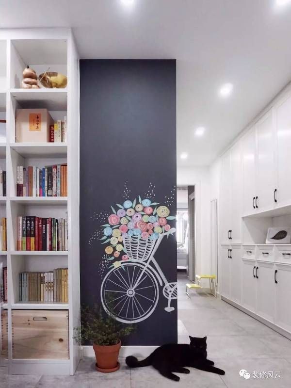 喜欢画画的卷卷绿,在客厅和走廊拐角处,刷了一面黑板墙,自己没事儿的时候就涂涂画画。