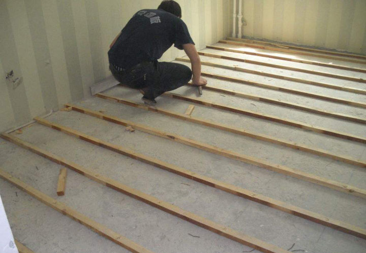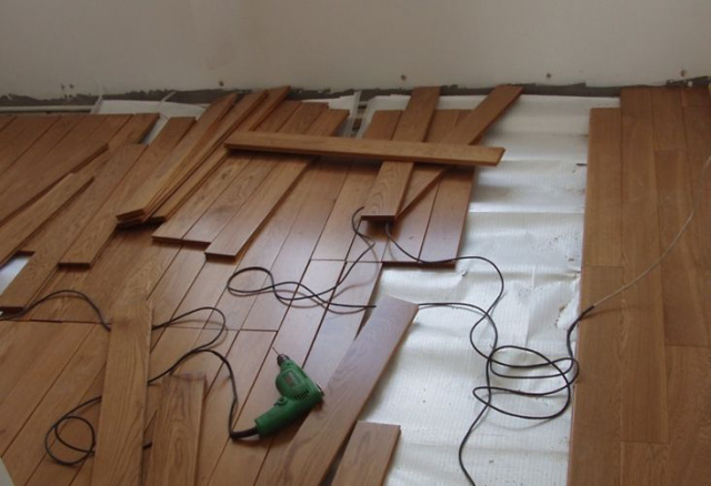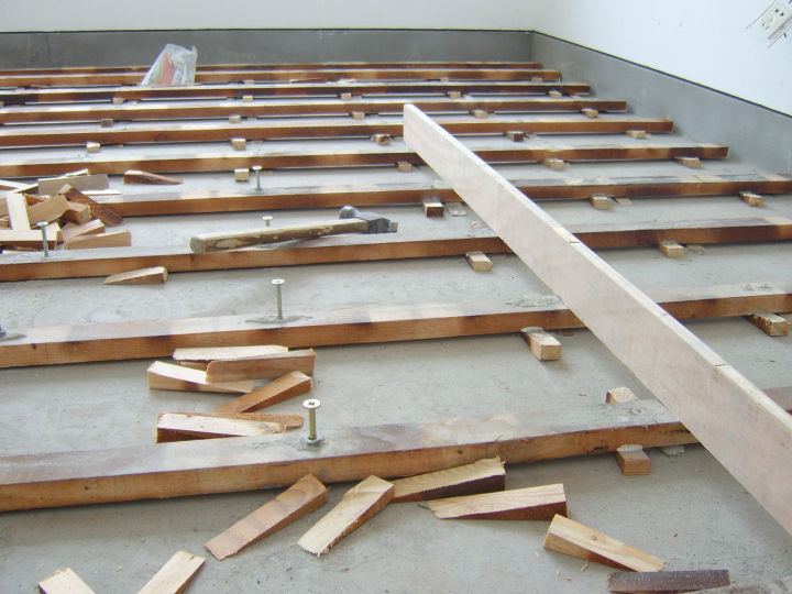 步骤是:先用钉子把龙骨固定在地面,铺一层防潮垫,再把地板固定在龙骨上。