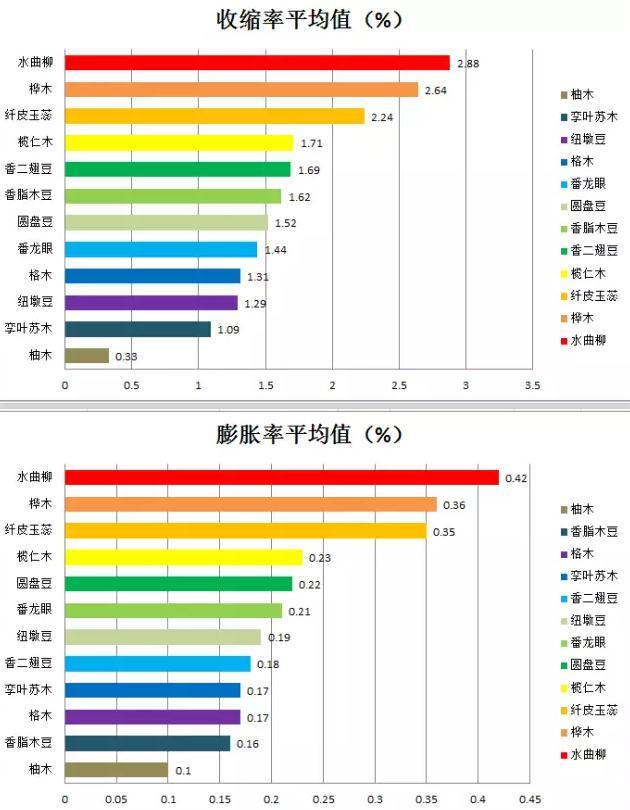 看图可知,12种实木中,柚木的收缩率和膨胀率都最低,稳定性最好。可见地暖如果使用实木地板,柚木的最为合适。