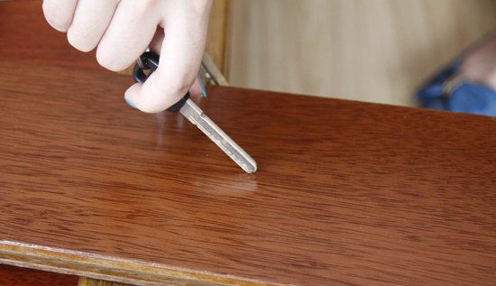 可以拿自己的钥匙尖等硬物,用力划地板表面,如果出现明显的凹坑,就说明耐磨层太软、转数低。(划之前和店员确认一下,否则我怕你被打……)