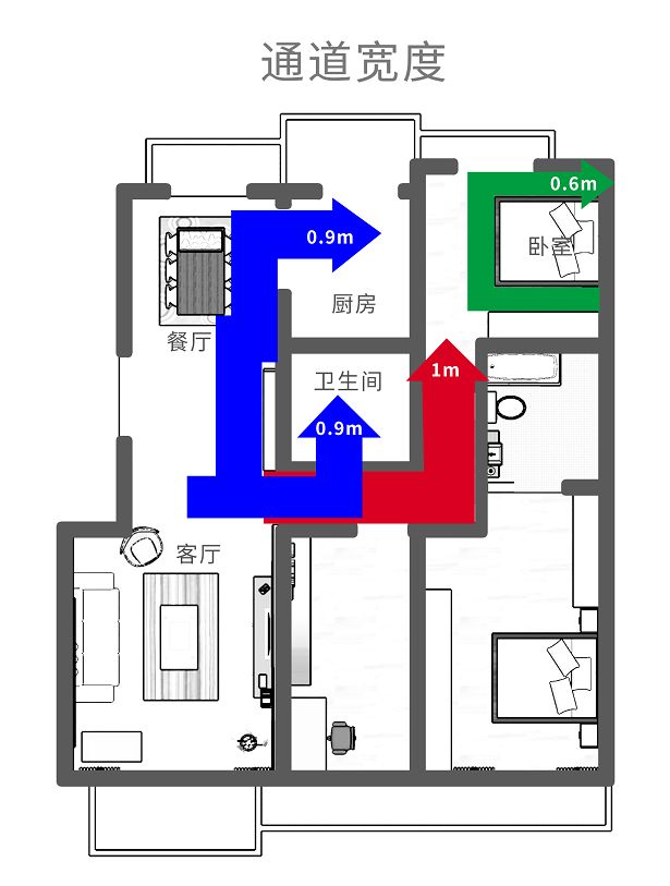 - 去卧室、客厅过道净宽不应小于1m,卧室内通道不小于0.6m;