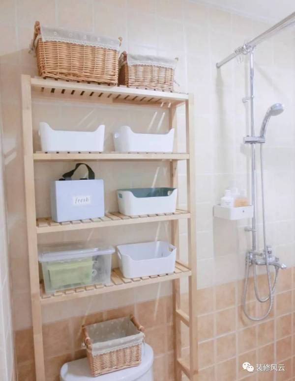卫生间也不大,没办法做干湿分离的卫生间,就做了一个浴帘。马桶上顶天立地的置物架,好看又实用。