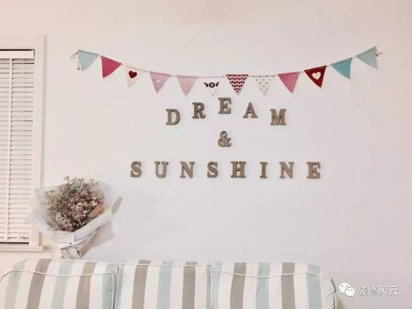 沙发后面的墙,也不能太单调,粘上一些装饰的彩旗,贴上一些文字。有没有很温馨的感觉?