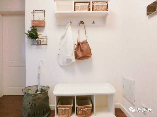 进门的玄关,小户型,充分利用墙面的空间,网购了无痕钉,在玄关的墙壁上钉上了一些可以置物的小箱子。