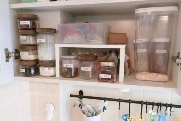 橱柜的内部,也要好好利用起来,还是使用统一的透明玻璃罐,贴上标签,一目了然。