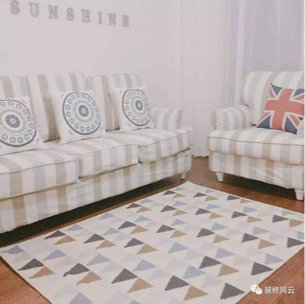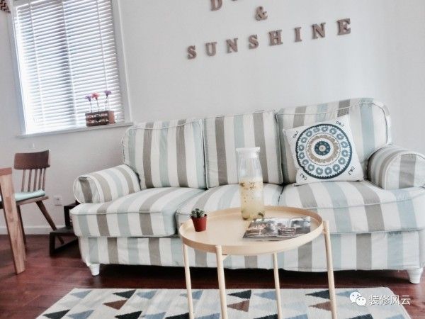 条纹状的布艺沙发,小清新范儿十足。其实家里面人都反对momo选择布艺沙发,说太难打理,momo说,我自己打扫呀!