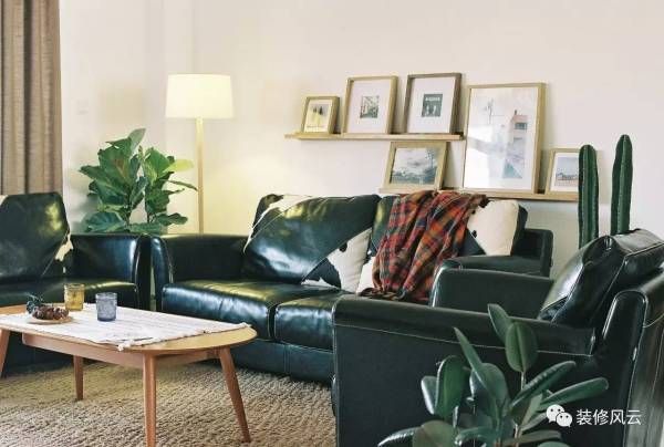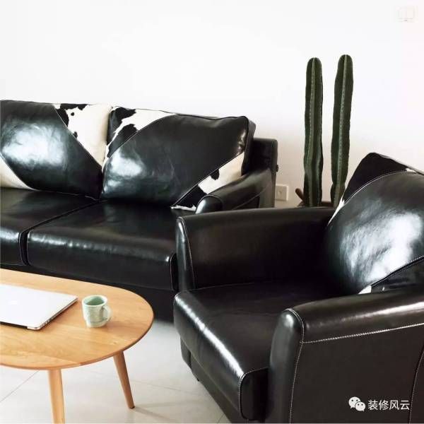 软装的搭配才是重点,客厅的沙发是最先入场的,有没有觉得沙发靠背的奶牛花纹很萌?而且皮质沙发非常好打理,厚重的黑色跟餐厅的黑色吊灯和黑色门框完美对应,跟木质的茶几也很搭~