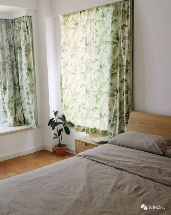 客厅和阳台有很多绿植,卧室没有摆放过多的绿植,选了有植物元素的窗帘,风格统一起来。
