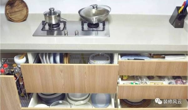 原来的厨房,下柜都做成了搁板式的,非常不方便,拿个东西,都要蹲下去找半天,全部改成抽屉,一目了然,轻松拿取。