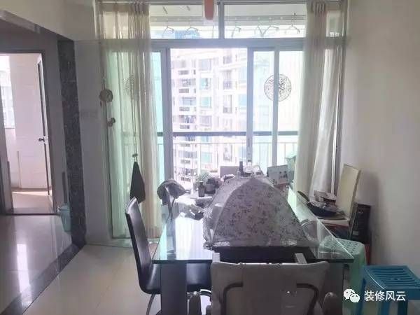 原屋主的餐厅,东西摆放得乱七八糟,餐桌和餐椅完全不搭,还使用了看起来很廉价的塑料凳子,整体搭配都显得不和谐。