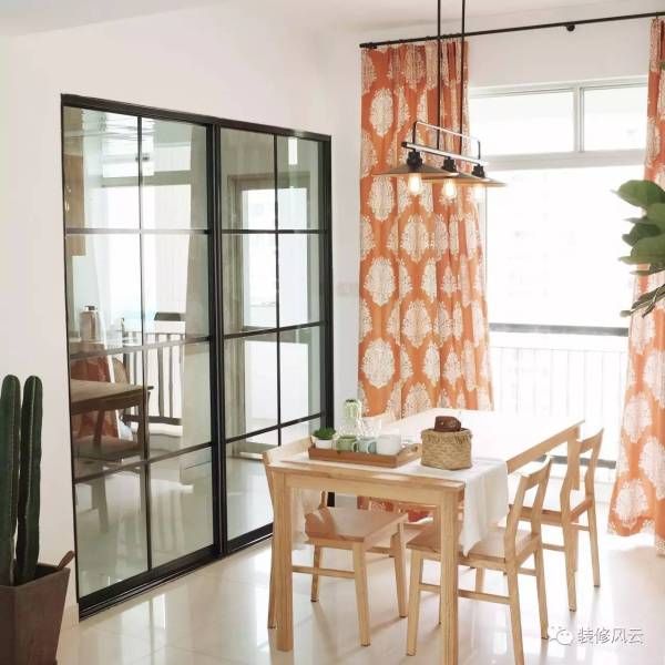 给餐厅和厨房之间加了一个北欧风十足的黑边框玻璃隔门,不影响厨房的采光,还能让整个空间更有层次,当然,还有阻隔油烟的作用。