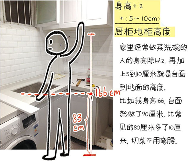 家里常做饭的人身高除以2,再加5~10cm,就是橱柜台面到地面的高度。