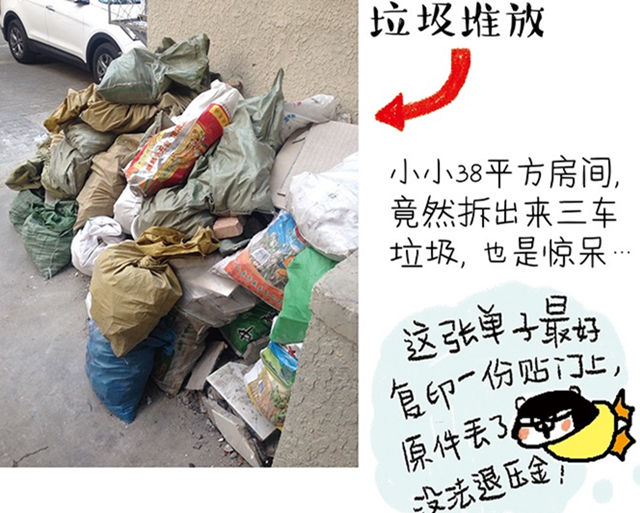 单子包括押金、垃圾清运、承重墙禁拆等条目:新小区的押金一般按房屋面积计算,每平方米几元钱;垃圾先堆在楼下指定位置,再由物业或工长派车运走,每车大概400元,PP家仅仅38平,就拆出了3车垃圾。