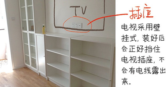 为了藏书,PP的电视柜也是书柜,比普通的电视柜高,因此电视插座要上挪,免得被书柜挡住。再记住电视尺寸,让插座正好藏在电视后面,不会有电线露出来。