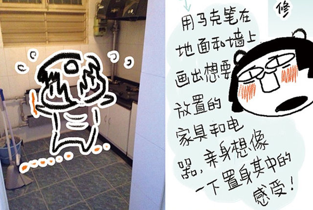 具体操作是:在地面和墙上,用马克笔画出想要放的家具和电器的位置,想象一下置身其中的感受,比如在客厅里,就假装自己躺在沙发上,想象电视就在眼前……