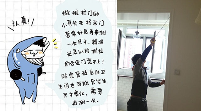 第一次,在瓷砖和过门石贴好以后,测量门洞尺寸;第二次,装好门套以后,再精确测量一次,防止门做好却装不进门套。