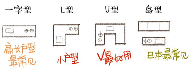 U型的可操作空间最多,但考虑到人的活动,台面中间的距离不能小于1.2米。