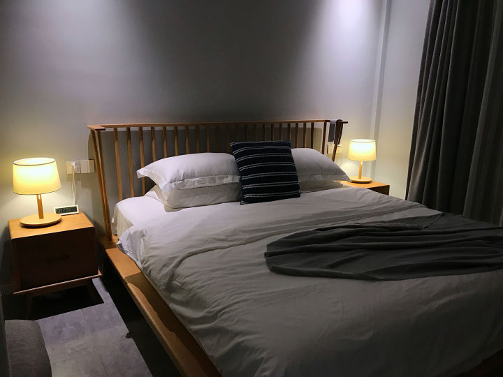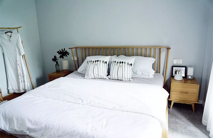 主卧原本设计为床+衣柜的组合方式(主卧和卫生间的隔墙改造正是为此,增大卧室面积,以便放得下衣柜),后来实在喜欢这件外形俏皮的原木衣架,又因未来几年间只有周末会在新家居住,衣物不会很多,就暂时放弃了定做衣柜,并在床下加了收纳衣物的盒子,目前还适用。