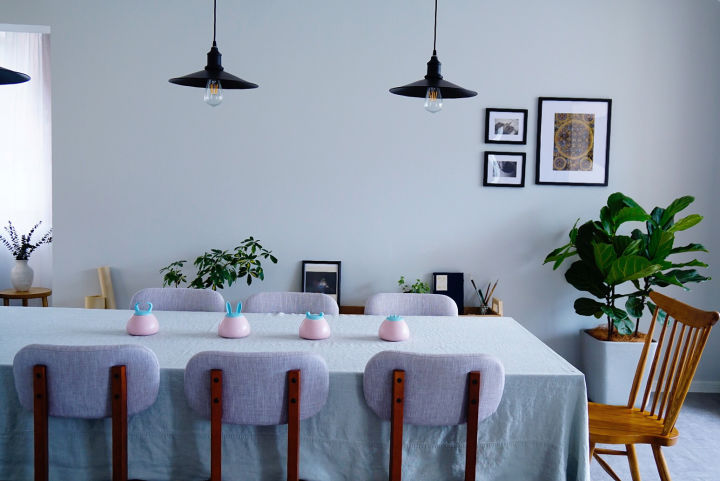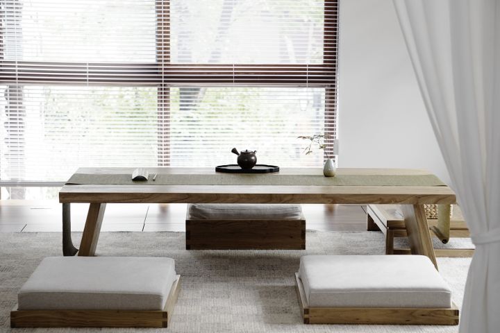 准确来说,餐桌是由分体的两部分拼成的,1800x900mm的大桌和600x900mm的小桌。两张桌子可以按需要组合,吃饭,布茶席,烘焙,品酒,写毛笔字,用途多多,特别是在小平台喝茶看书时,把小桌挪过去非常方便。