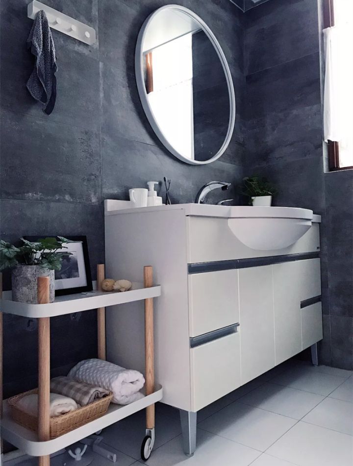 通常来讲,洗衣机应该局部固定在墙上,才能保证机器在使用中不会乱晃,但柑橘家尺寸实在太合适,架子一点晃动的余地都没有,而且架子卡紧,加固了洗衣机位,洗衣机正常震动完全不会带动架子,自然不必再和墙连接。