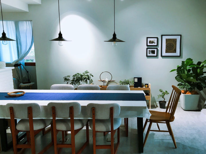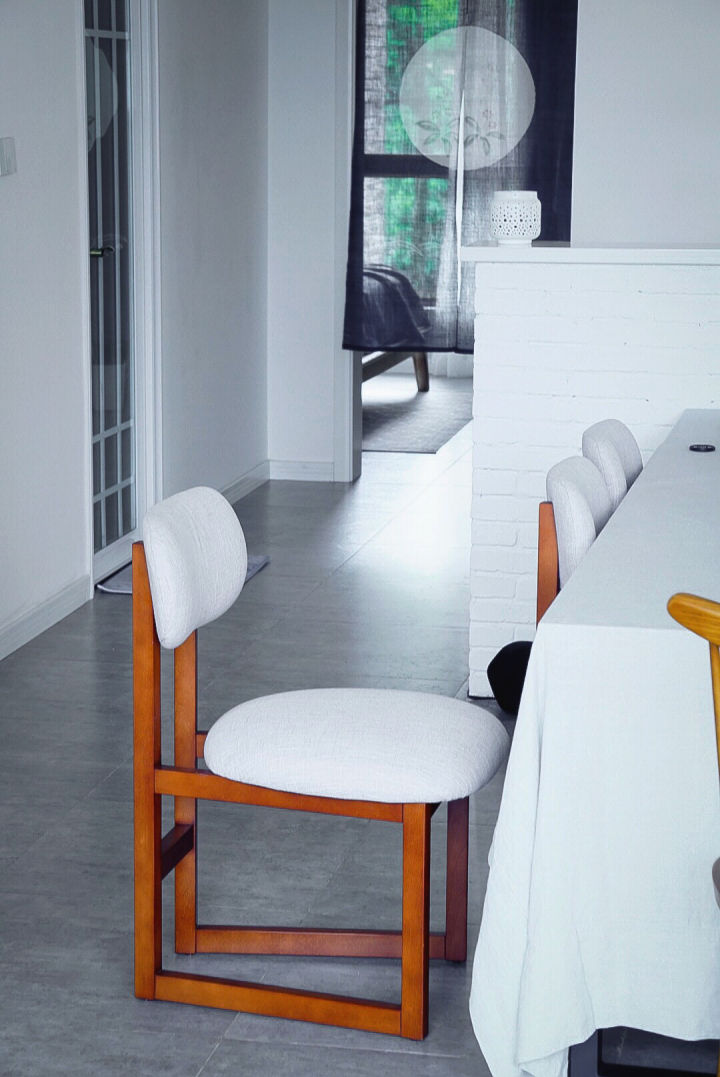 小平台走进来就是客厅,因为身边朋友都喜欢美食和茶道,所以没有按照传统模式摆放沙发,而是放了一张2.4米长的定制餐桌,为代替沙发,选择了六只舒适度很高的8点椅,和轻巧灵活的温莎椅配合使用。