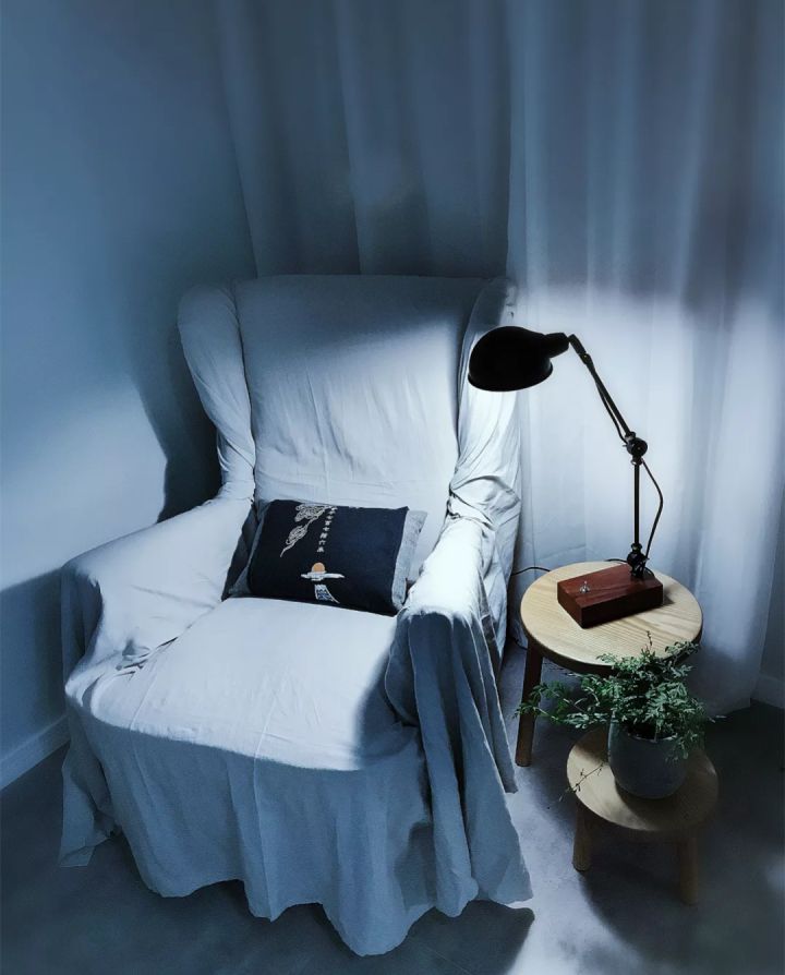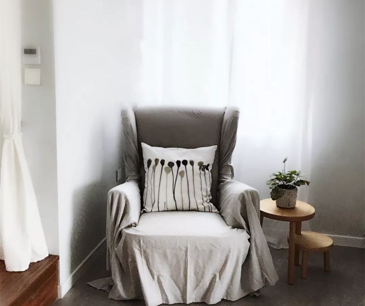 从客厅到卧室之间有一个小小的过厅,作为公共到私密的过渡,摆上单人沙发、边几和台灯,成为休闲一角。