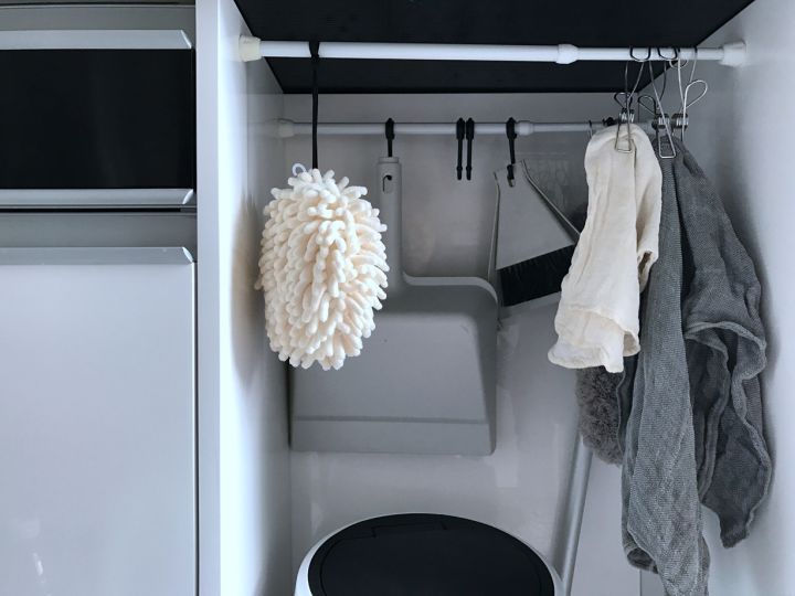 岛台背面专门留出一个空格,藏垃圾桶,还撑了伸缩杆,挂抹布和清洁用具,配合岛台上的水池,做家务很顺手。
