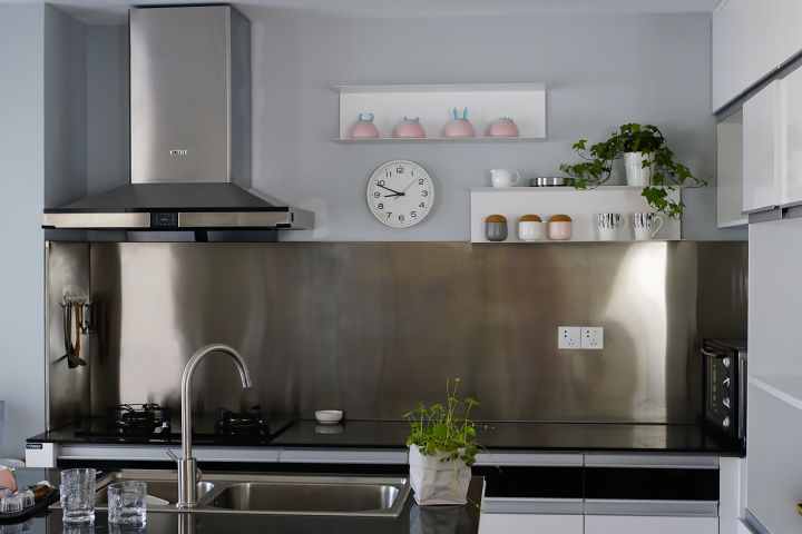 意外的是厨房没有贴瓷砖,只刷了芬琳漆,然后挂了定制的不锈钢挡板(不锈钢好打理、好养护,是专业后厨的标配),700多元搞定。
