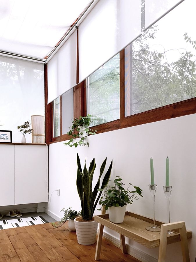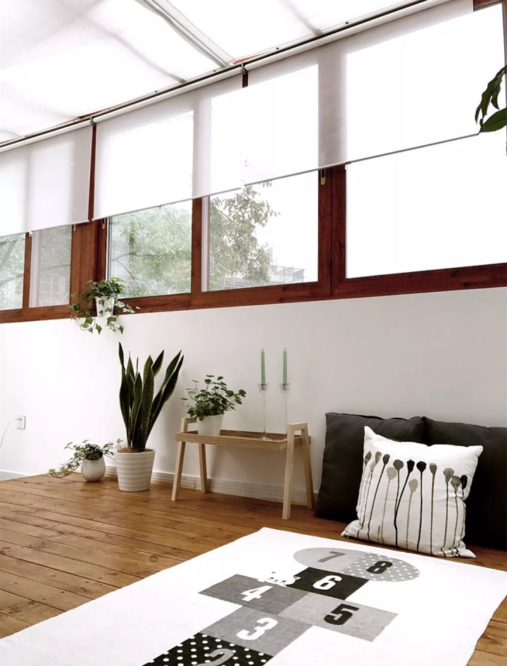 窗帘用了宜家的斯古斯拉芙卷帘,虽然每幅之间没法完全贴合,但微微透光的效果很好,伸缩也很容易操作。