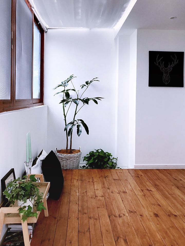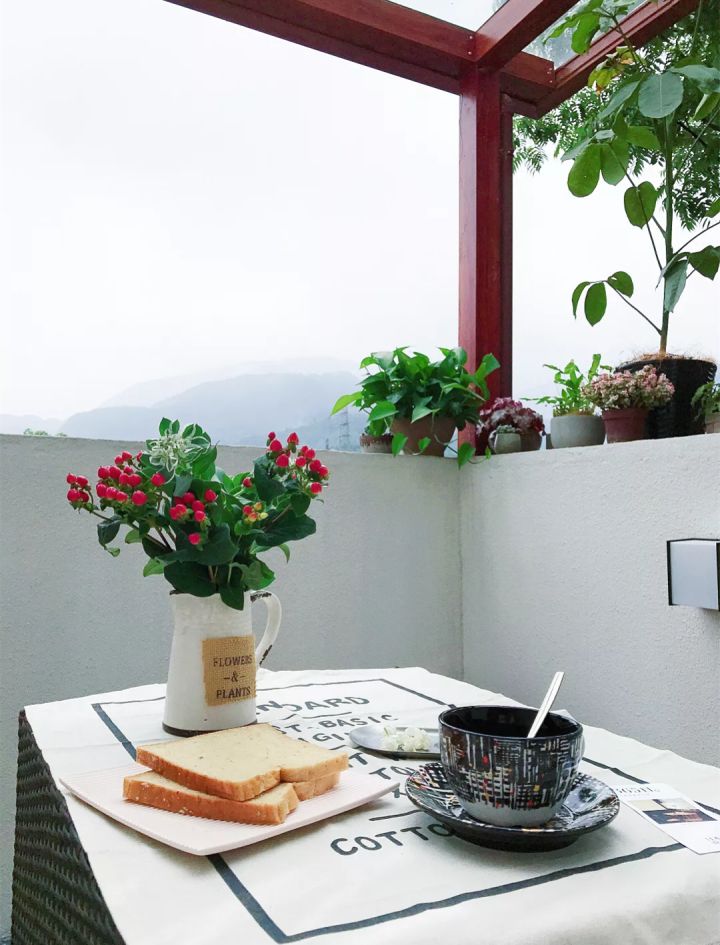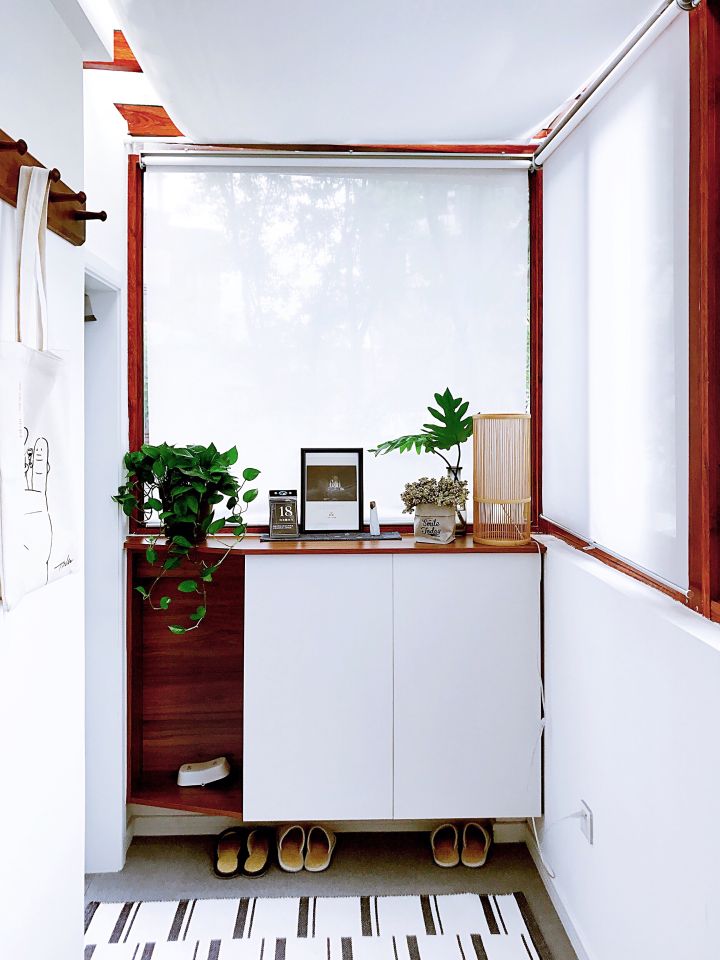 室外走廊原本宽1.35米,封上玻璃顶和玻璃窗后,留出入门鞋柜位,在原入户门位置向客厅推进90公分,铺设防腐红松木地板。这样不仅有了玄关,还有了一处3 x 2.25米的小平台,可以吃饭、看书、雨天喝咖啡、望一望窗外的峨眉山。