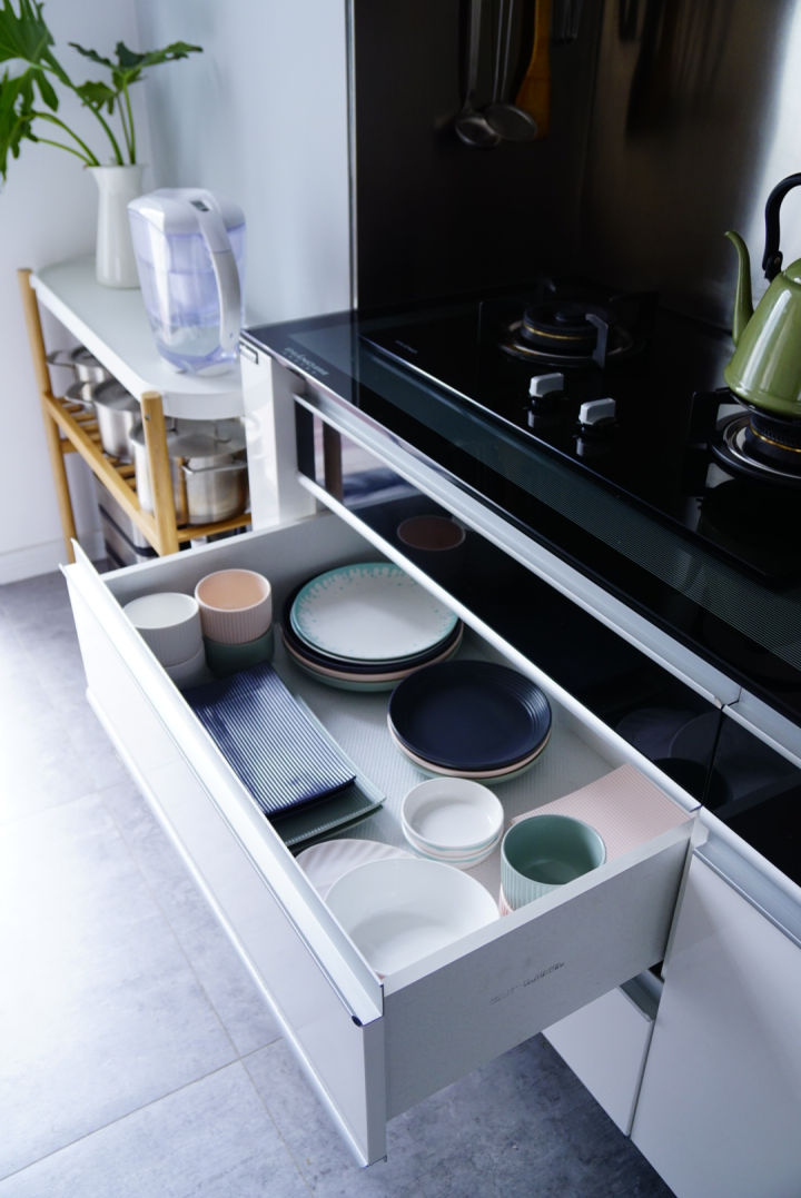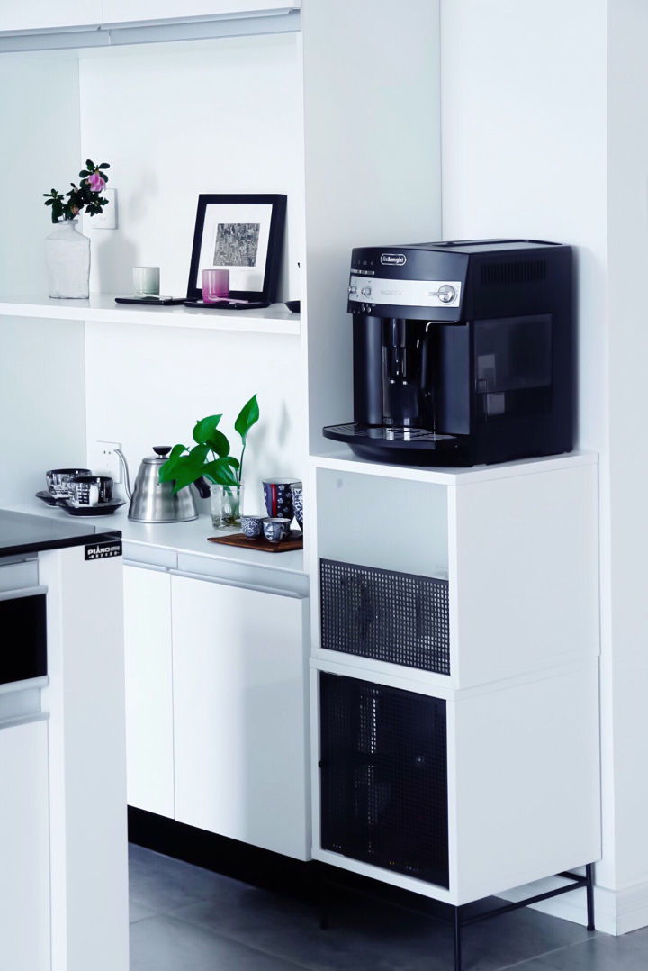 侧面做成凹凸墙的地方,放进三只木格子来收纳茶具,格子可以按心情堆叠组合,比柜子更有趣。