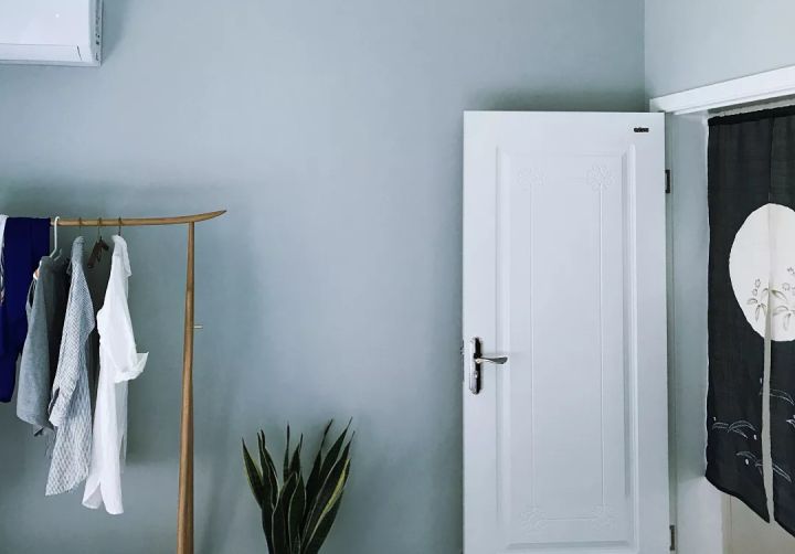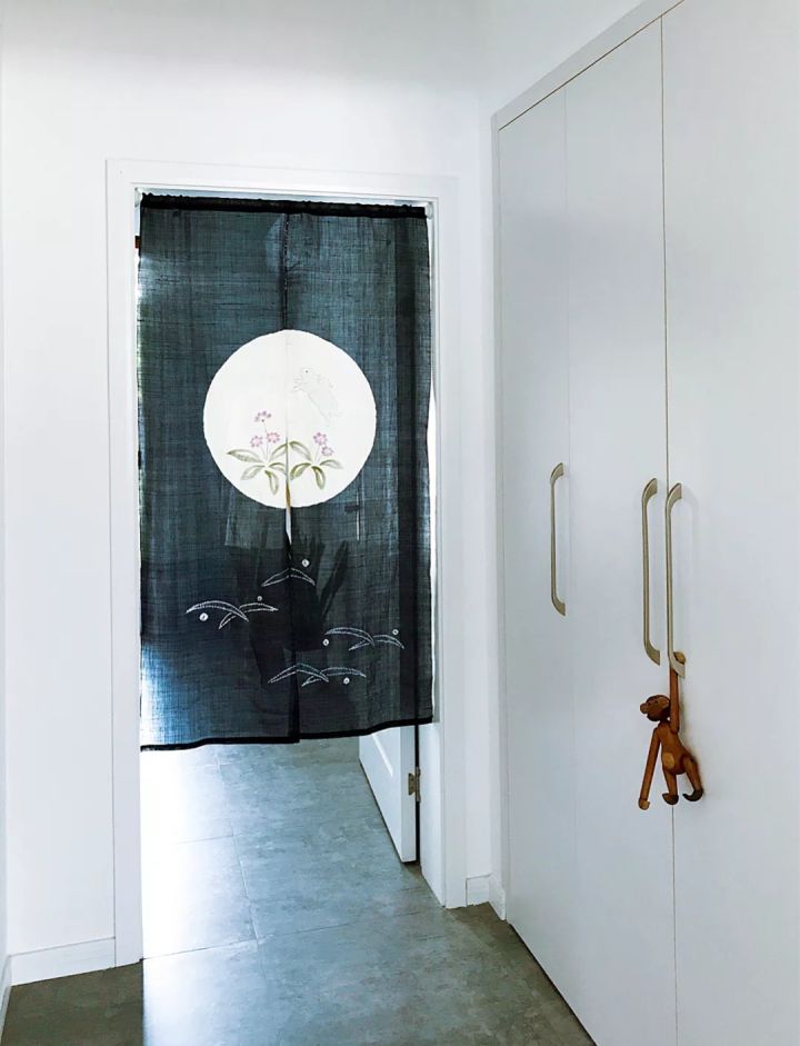 主卧门外留出的凹空间,封成白门的柜子。不希望客人直接看进卧室,挂了半帘稍稍遮挡。