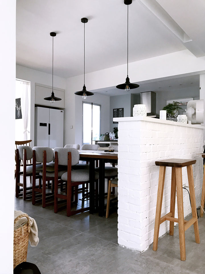 餐桌一端倚靠着吧台。整个吧台砌筑在地砖之上,就是先铺好了地砖,然后在需要的位置用水泥沙垒红砖,刷白,并在合适的位置预留电源插座。