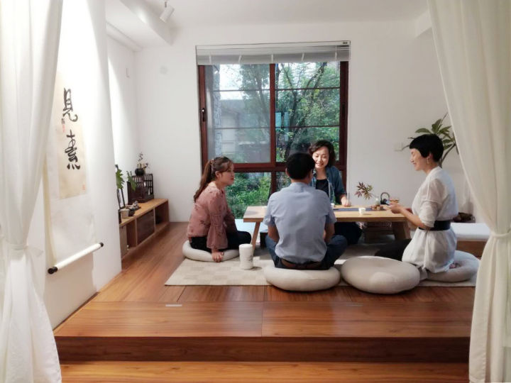 下图是柑橘在茶室待客,右边是重量级人物——《小家,越住越大》的作者逯薇老师。